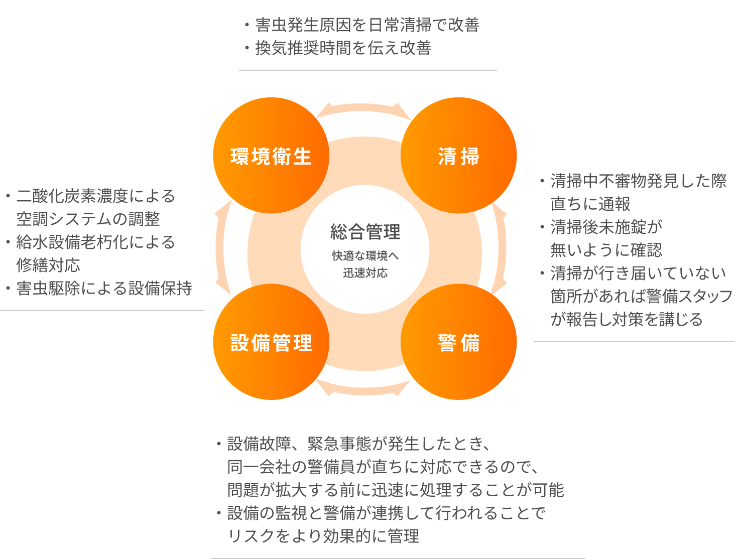 私たちは警備、清掃、設備管理、環境衛生の各サービスを一貫して提供し、お客様のビジネスと生活空間に安心と快適さをお届けします。